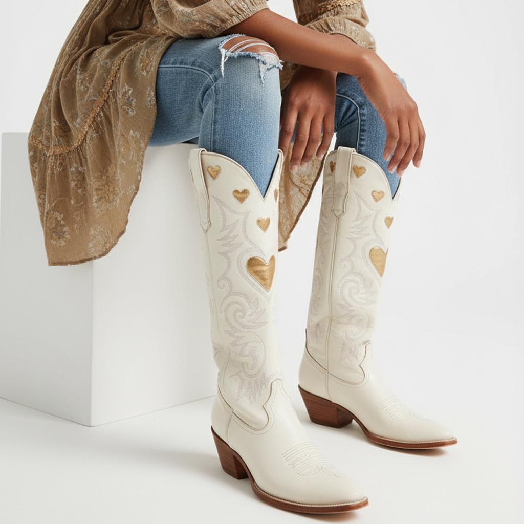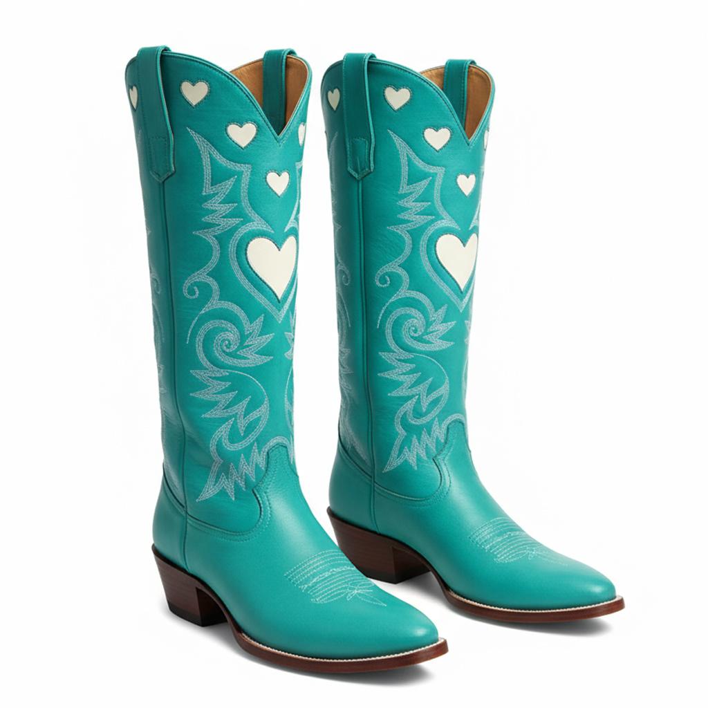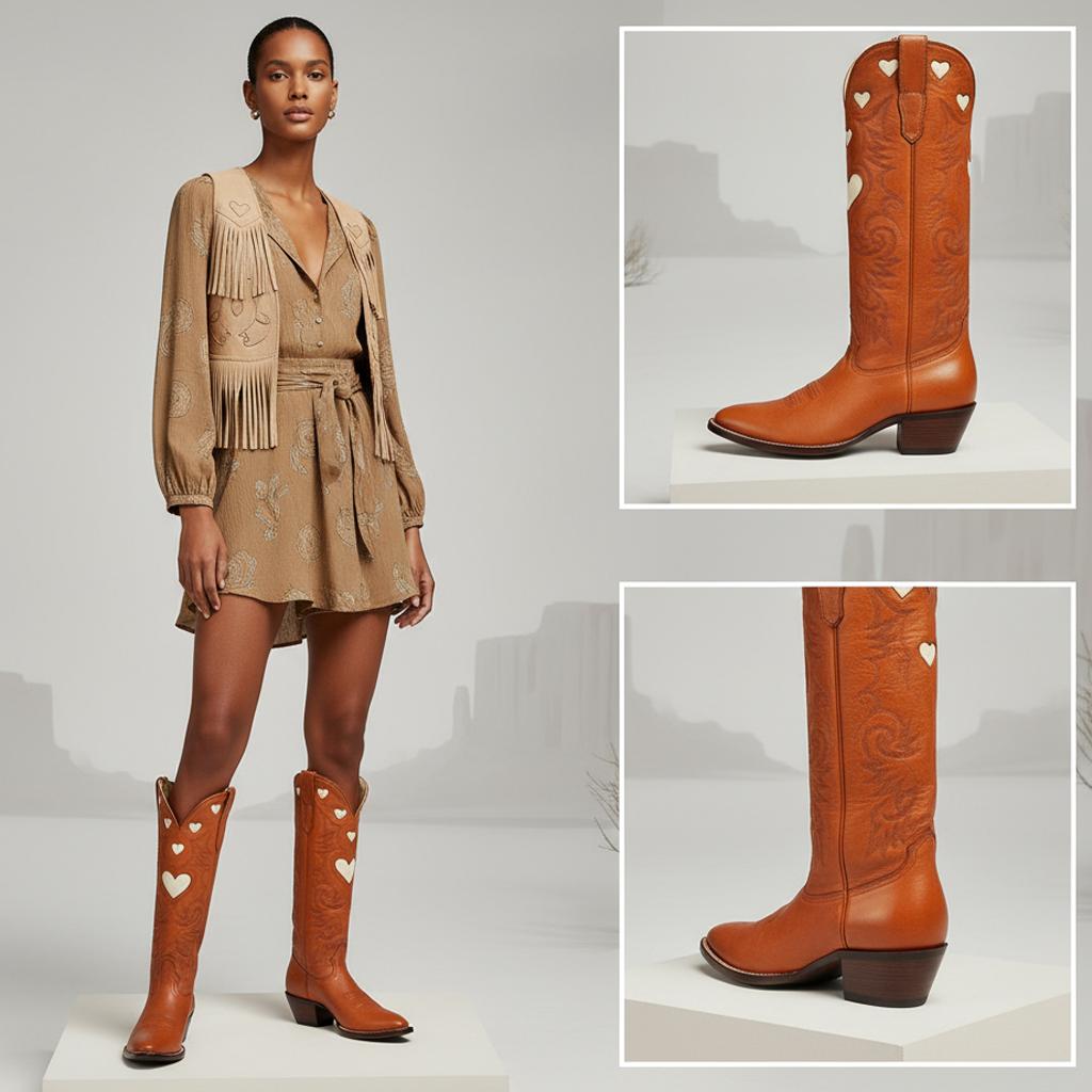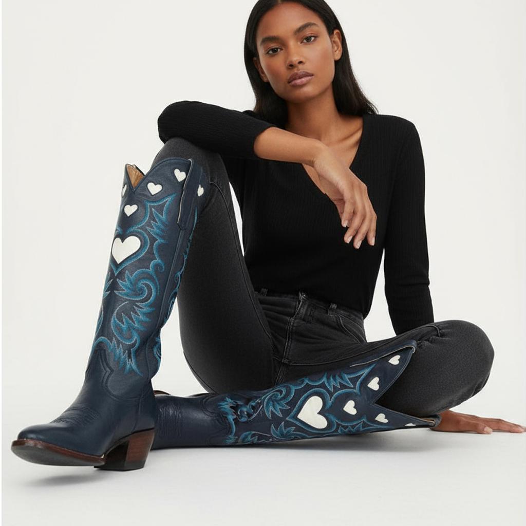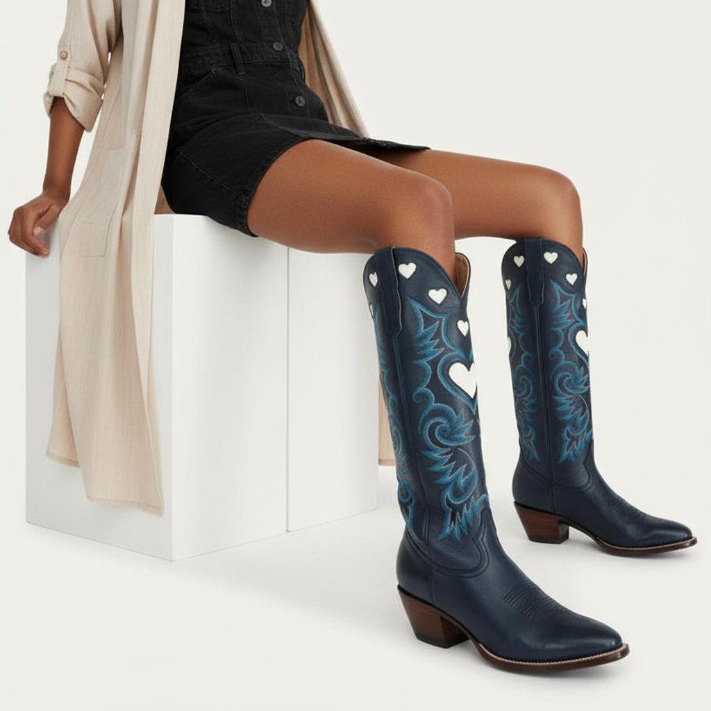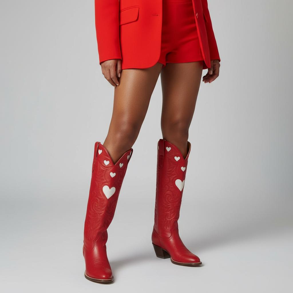 Elevate your footwear game with our Western Knee High Boots, uniquely designed for comfort and style. Crafted from genuine full-grain leather, these boots showcase exquisite hand-stitched embroidery that adds a touch of femininity with charming sweet pink hearts, ensuring you stand out in any crowd.