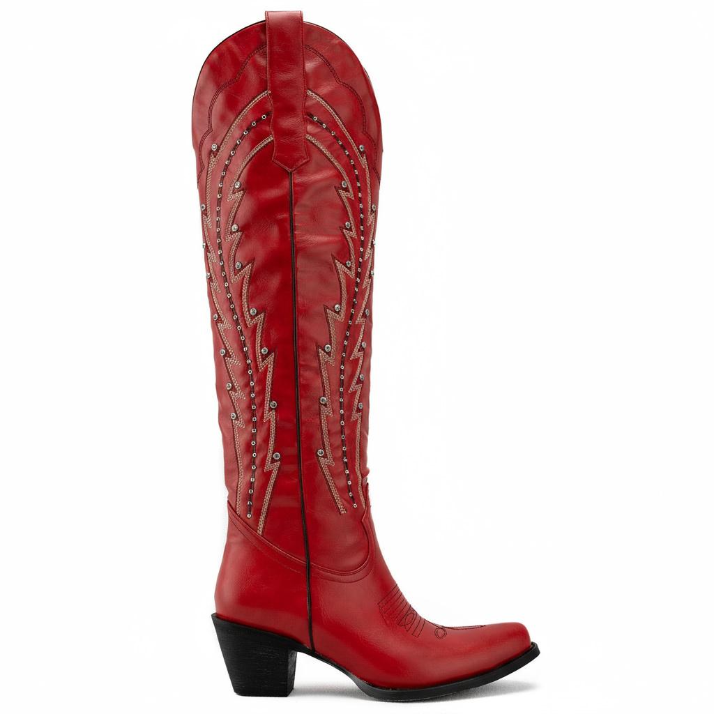 Introducing our Red Embroidered Studs Rhinestone Slip-On Snip Western Knee-High Boots. These boots blend unique craftsmanship with contemporary style, showcasing exquisite attention to detail, from hand-finished stitching to stunning rhinestone embellishments that elevate your look.