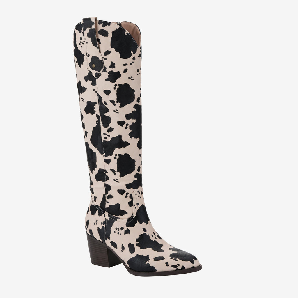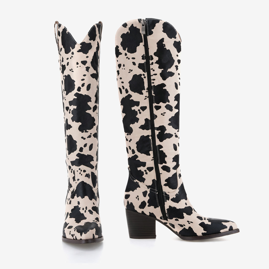 Experience unparalleled style and comfort with our Western Knee High Cowboy Boots, crafted from luxurious vegan leather. Immerse yourself in the unique craftsmanship that highlights an eye-catching animal print design, setting you apart at any event. These boots are more than just footwear; they embody sophistication and trendiness, perfect for parties or casual outings.