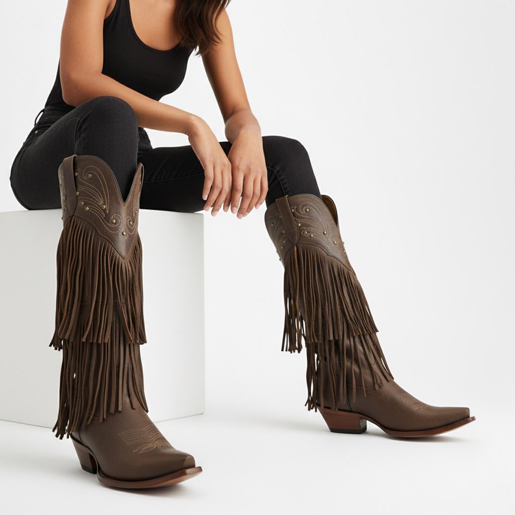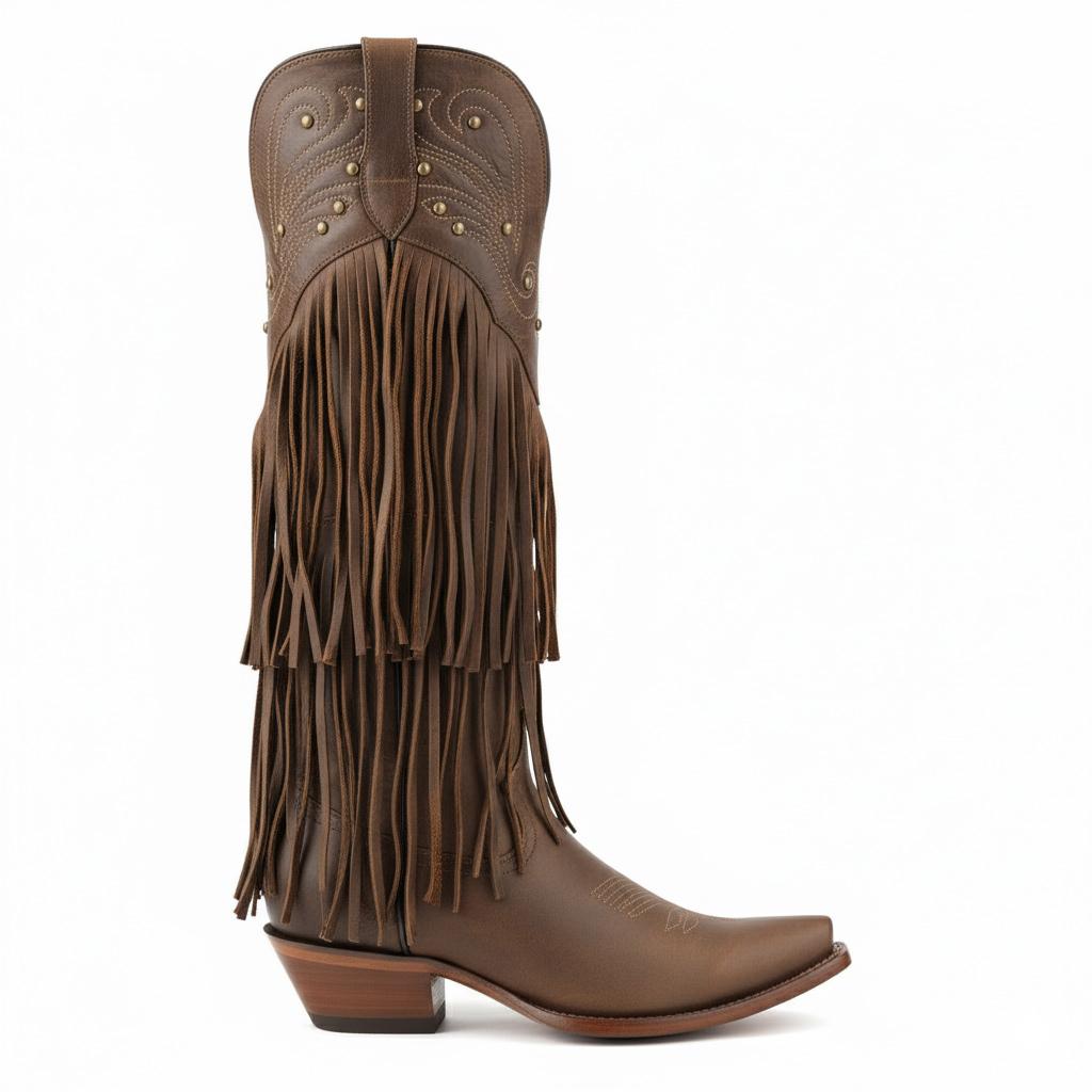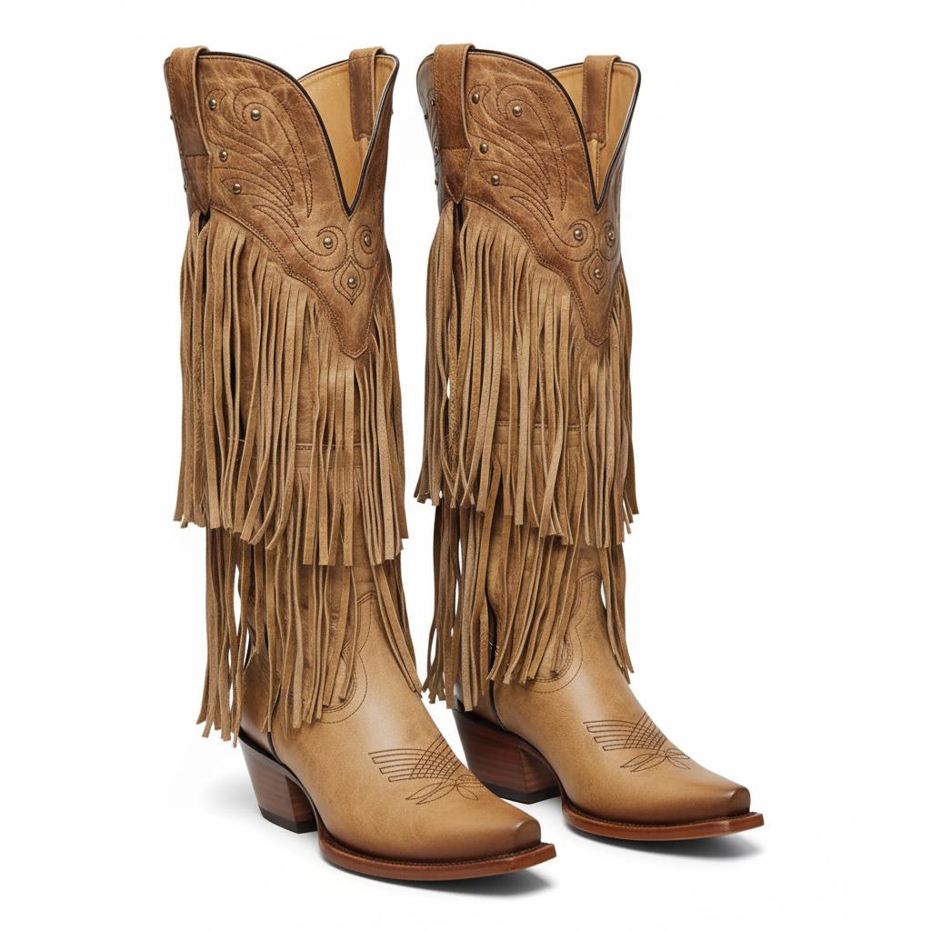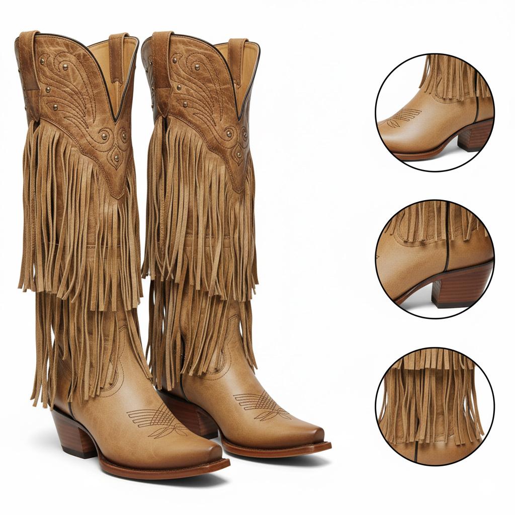 Introducing our Western Knee-High Cowboy Boots, meticulously crafted with a unique blend of style and functionality. These boots showcase an exquisite handcrafted design, featuring genuine leather lining that guarantees all-day comfort while exuding an air of sophistication. The stunning fringe and stud details highlight impeccable craftsmanship, making these boots a standout piece in any wardrobe.