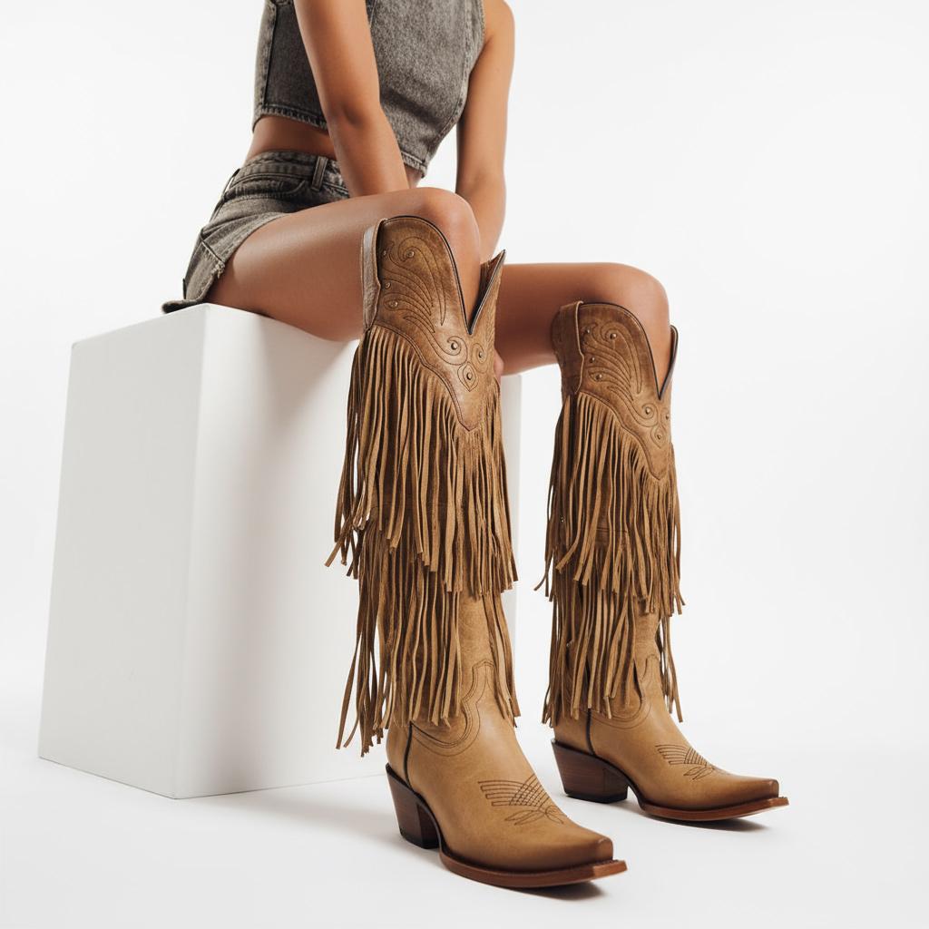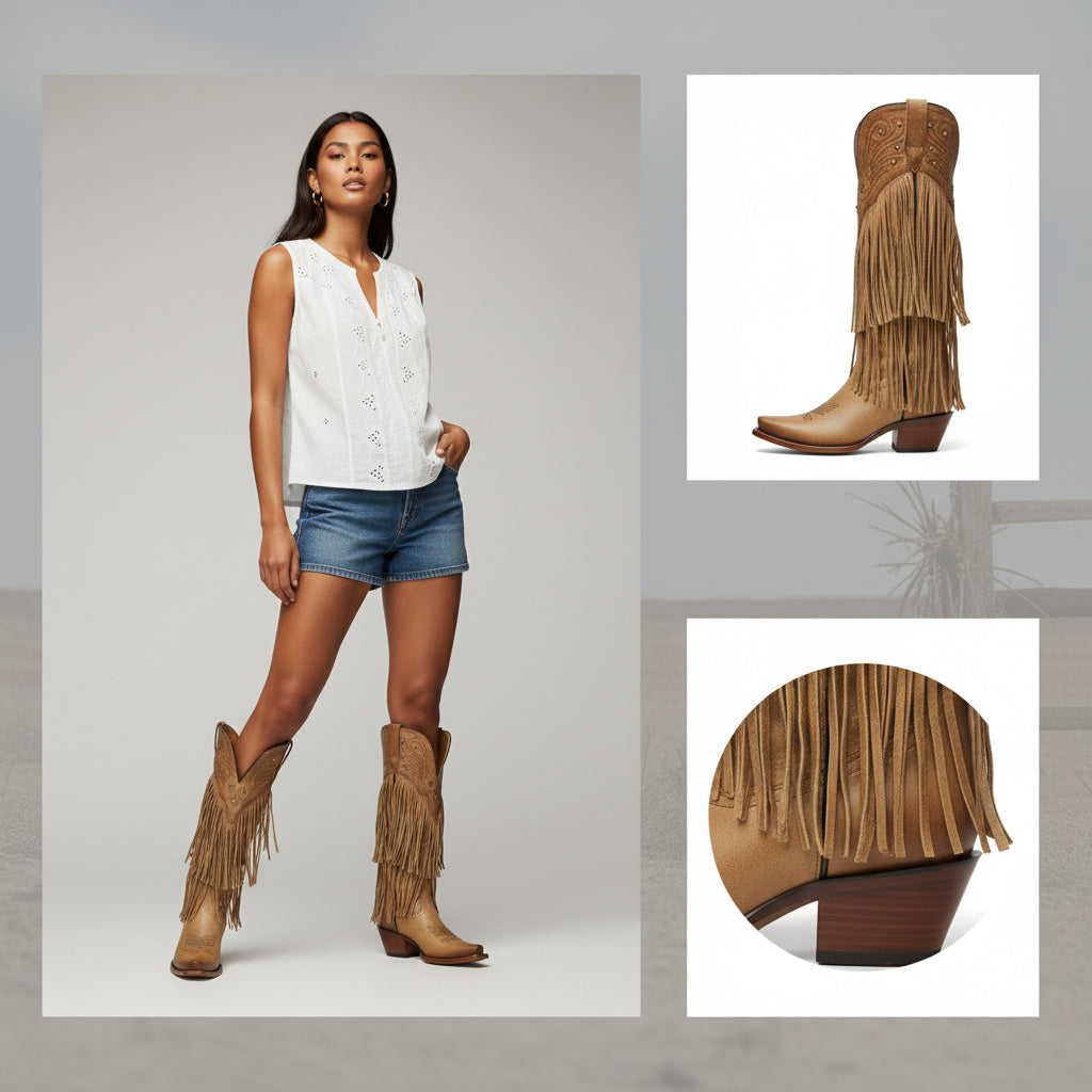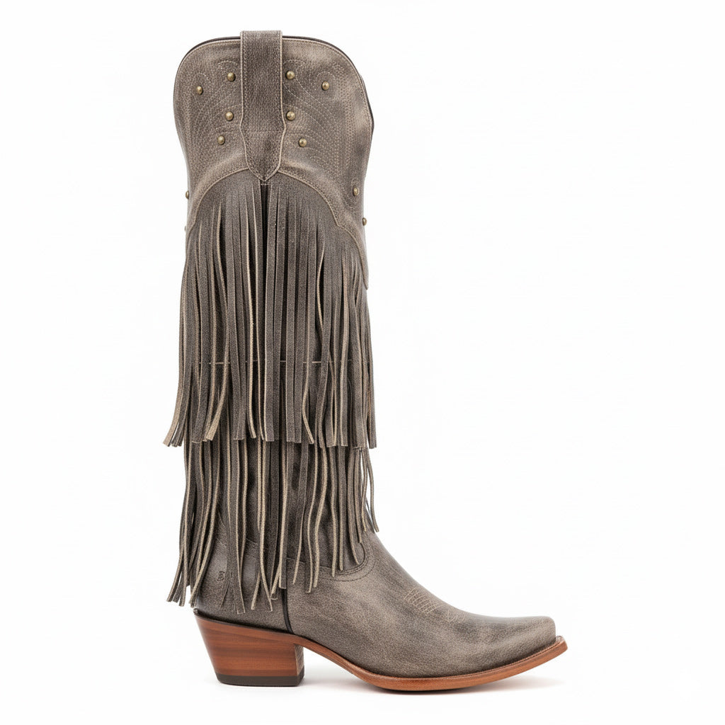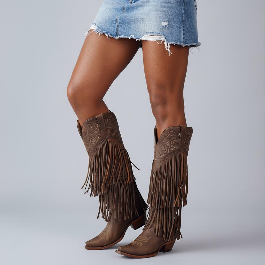 Introducing our Western Knee-High Cowboy Boots, meticulously crafted with a unique blend of style and functionality. These boots showcase an exquisite handcrafted design, featuring genuine leather lining that guarantees all-day comfort while exuding an air of sophistication. The stunning fringe and stud details highlight impeccable craftsmanship, making these boots a standout piece in any wardrobe.
