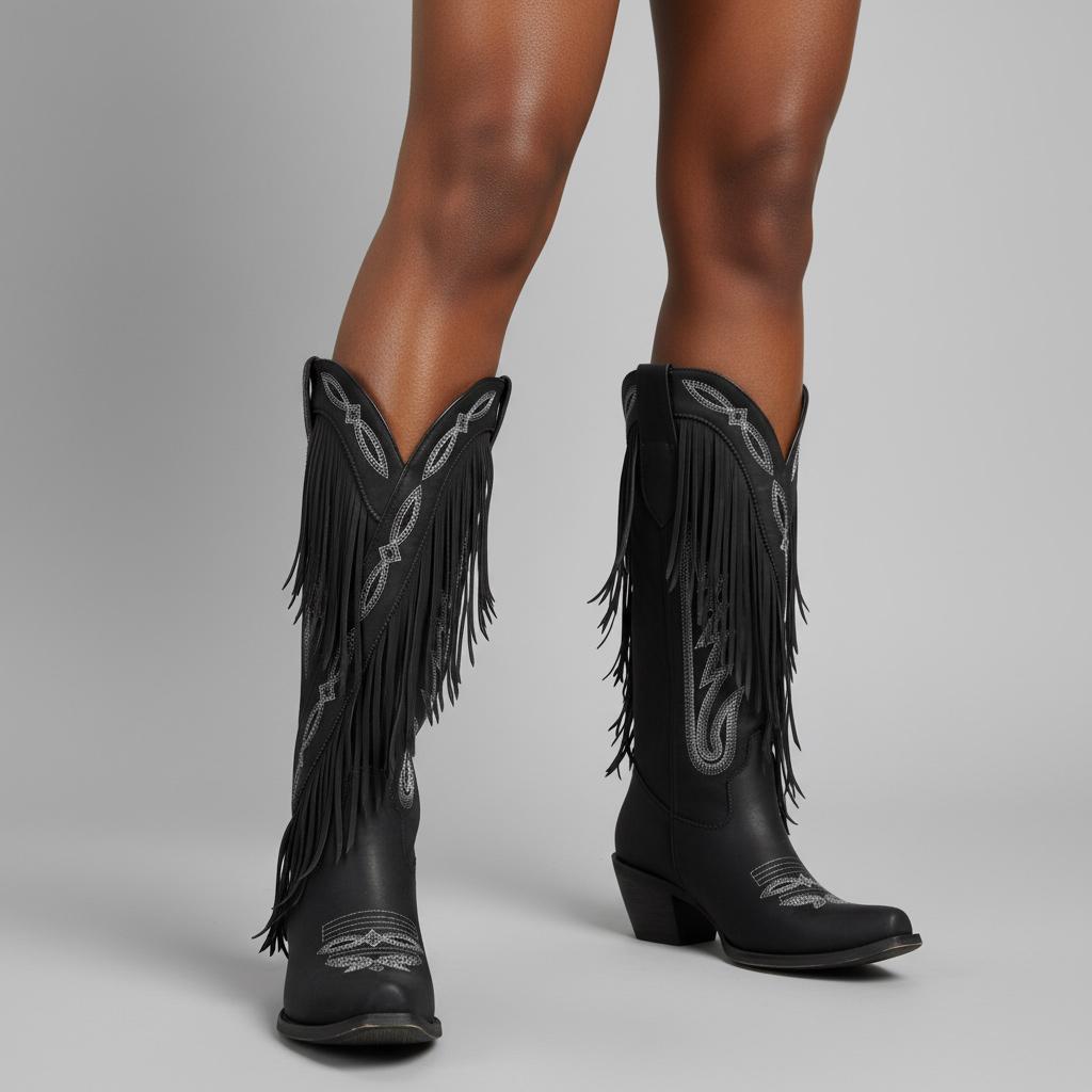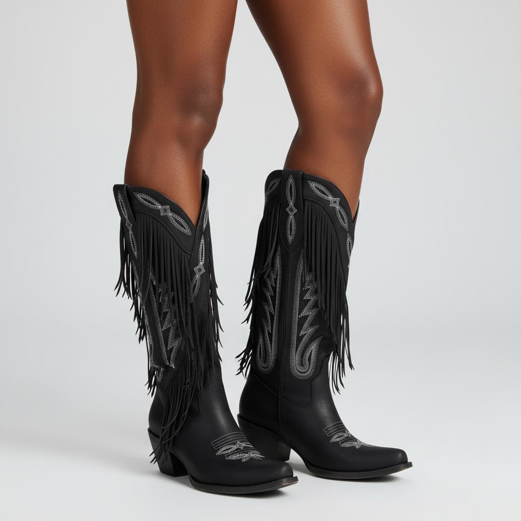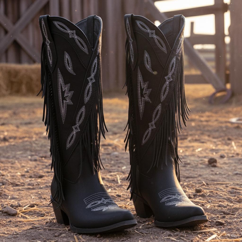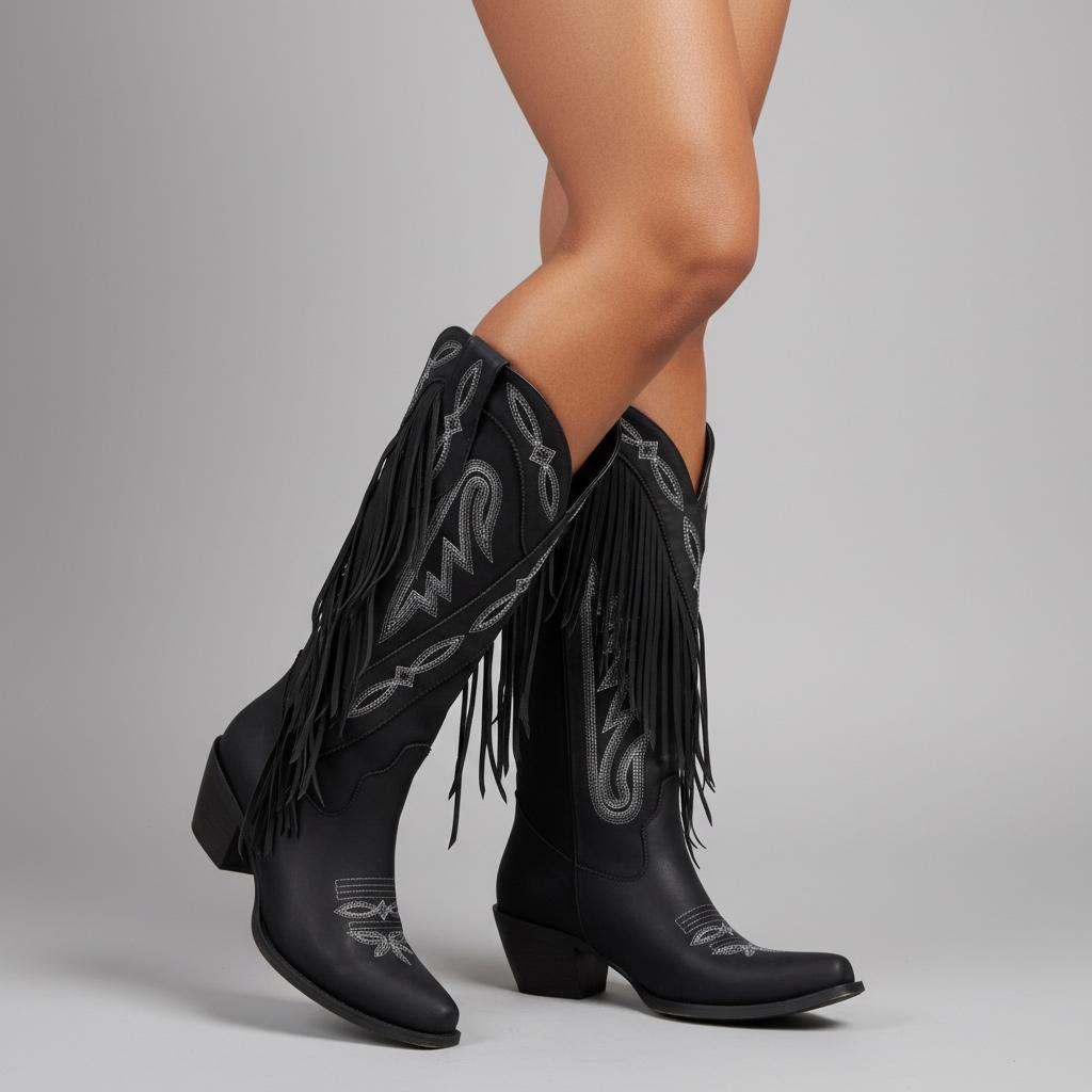 Experience the ultimate fusion of style and comfort with our Western Mid Calf Boots for Women. Handcrafted from premium breathable vegan leather, these boots feature a unique asymmetrical fringe design and chic embroidered detailing, setting you apart in any crowd. The 1.75-inch wide heel not only adds height but ensures all-day comfort, making them ideal for both casual outings and night events.