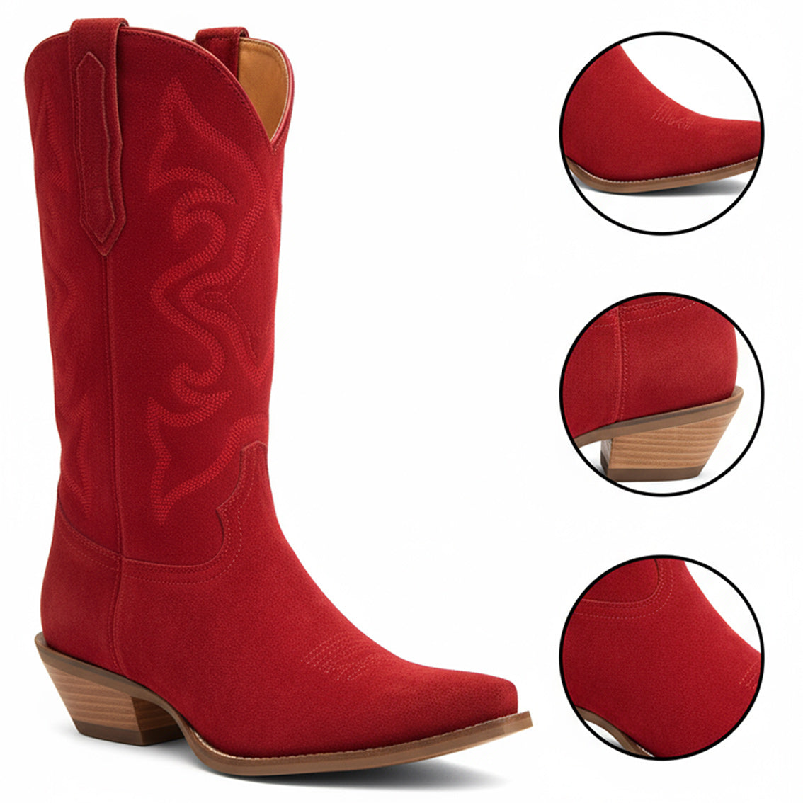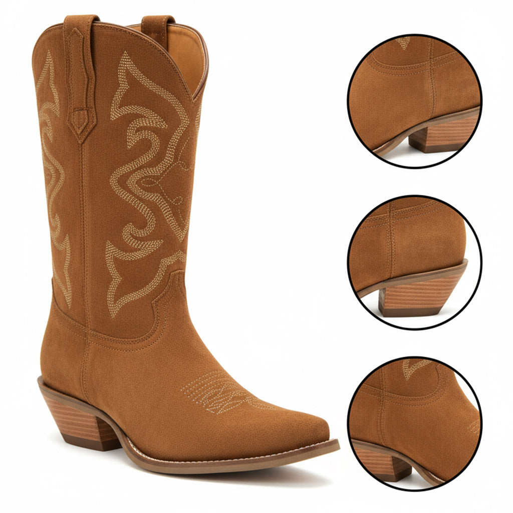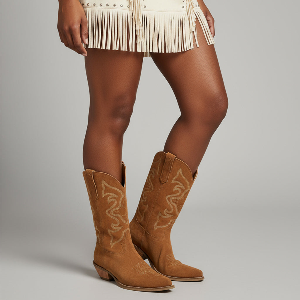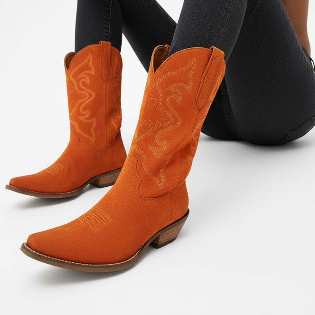 Introducing our Western Mid Calf Boots with a chunky heel and snip toe design, crafted to elevate your footwear collection with a unique touch. Made from high-quality faux suede and adorned with intricate embroidery, these boots offer a stylish yet practical addition to your wardrobe, perfect for any season.