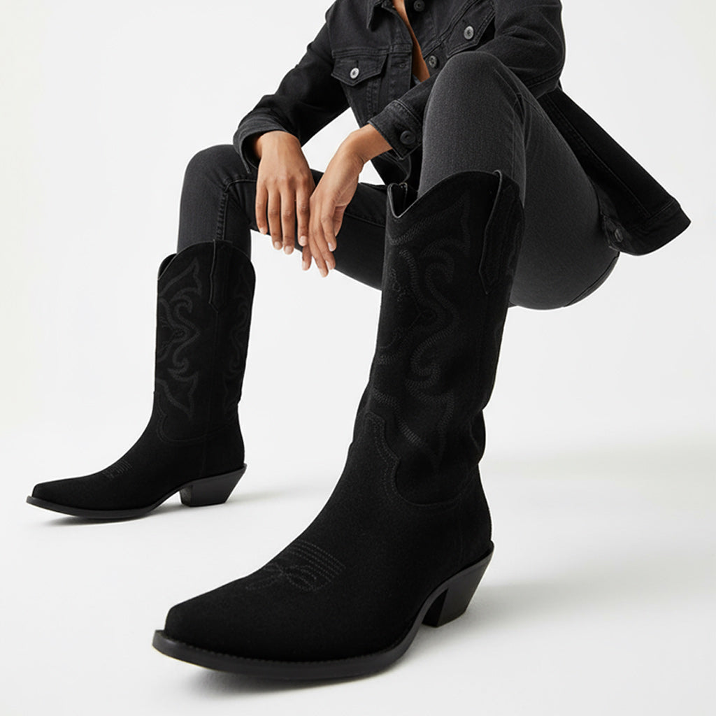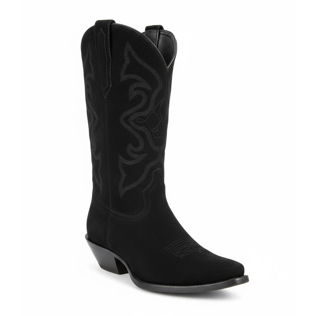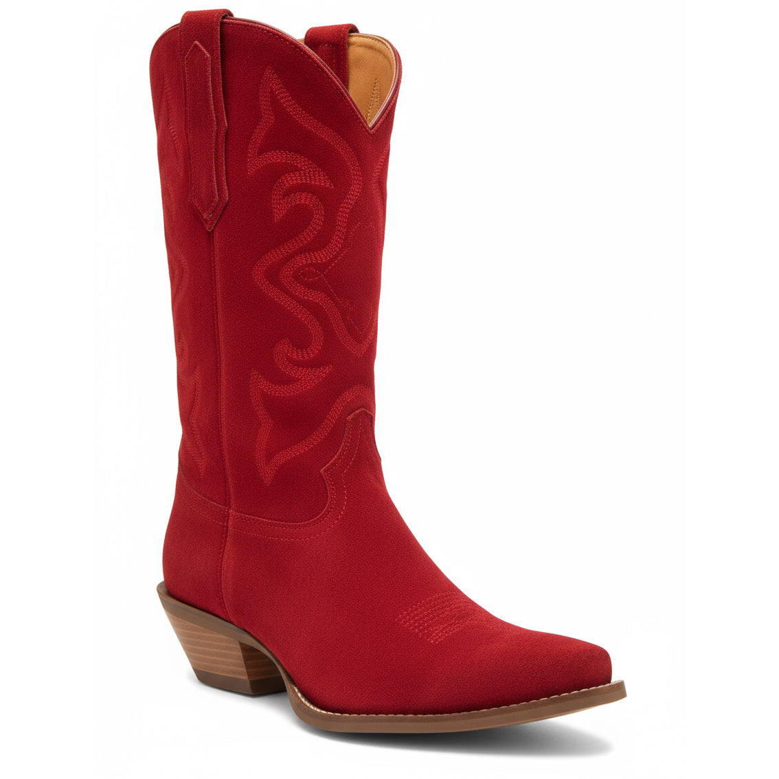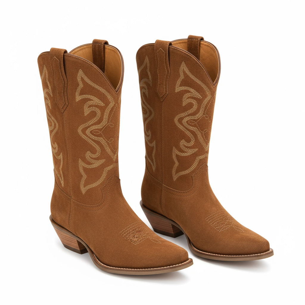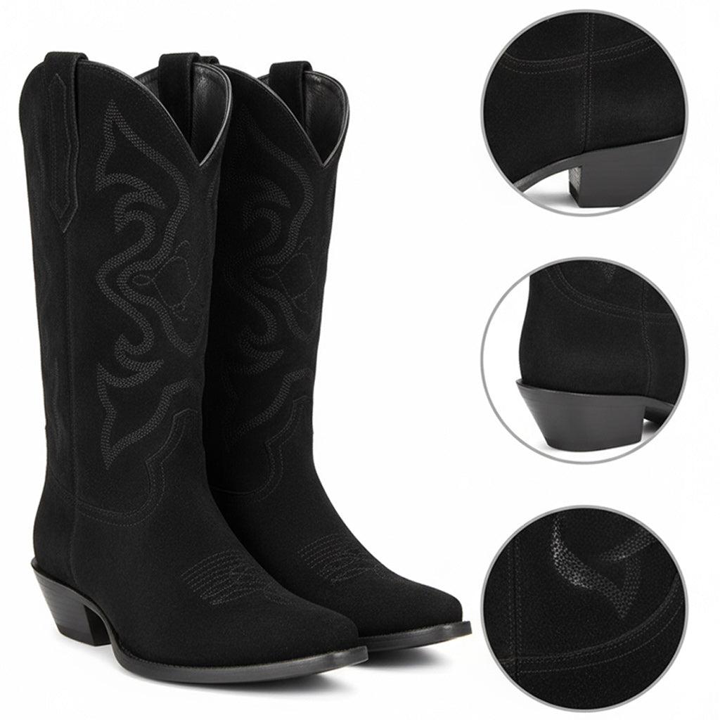 Introducing our Western Mid Calf Boots with a chunky heel and snip toe design, crafted to elevate your footwear collection with a unique touch. Made from high-quality faux suede and adorned with intricate embroidery, these boots offer a stylish yet practical addition to your wardrobe, perfect for any season.