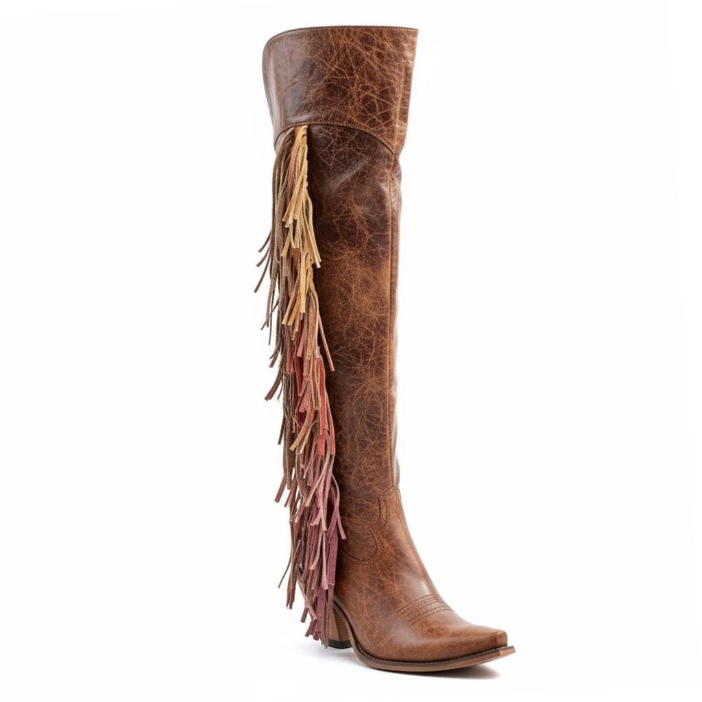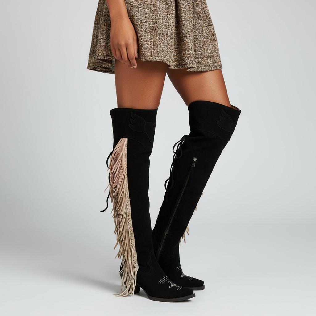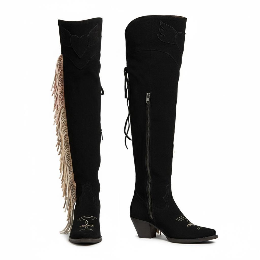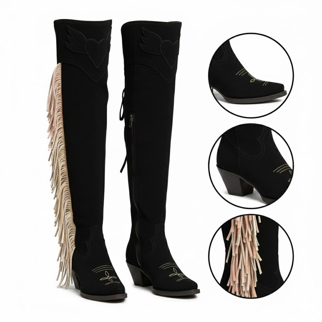 Embrace your bold style with our Western Over Knee Boots, crafted from luxurious faux suede. Each boot features an exquisite fringe and heart pattern, showcasing unique craftsmanship that captures attention and admiration. Designed with precision and care, these boots are perfect for the fashionable boho lifestyle.