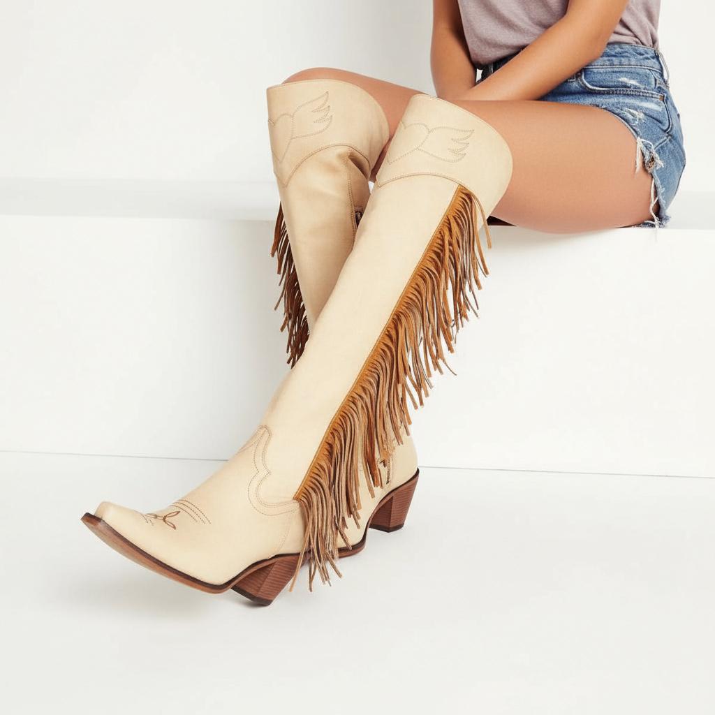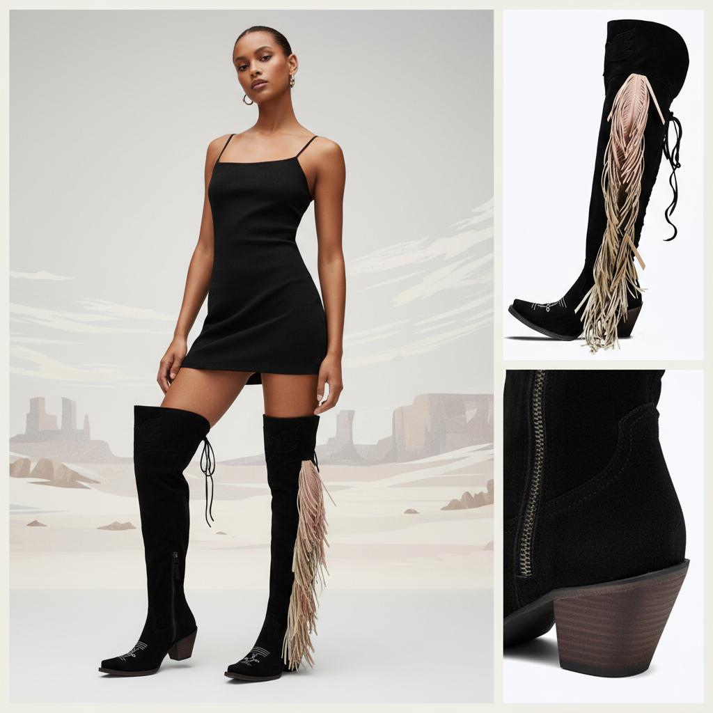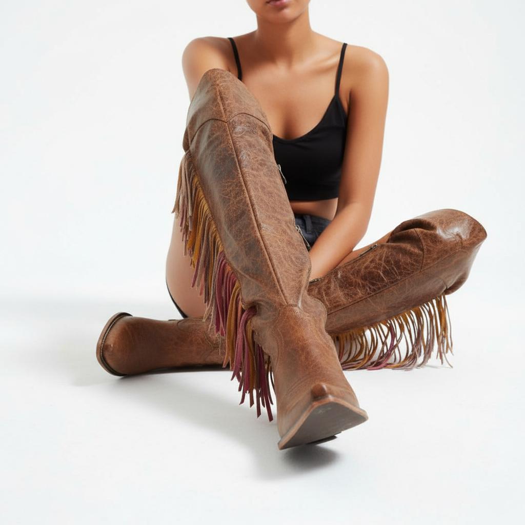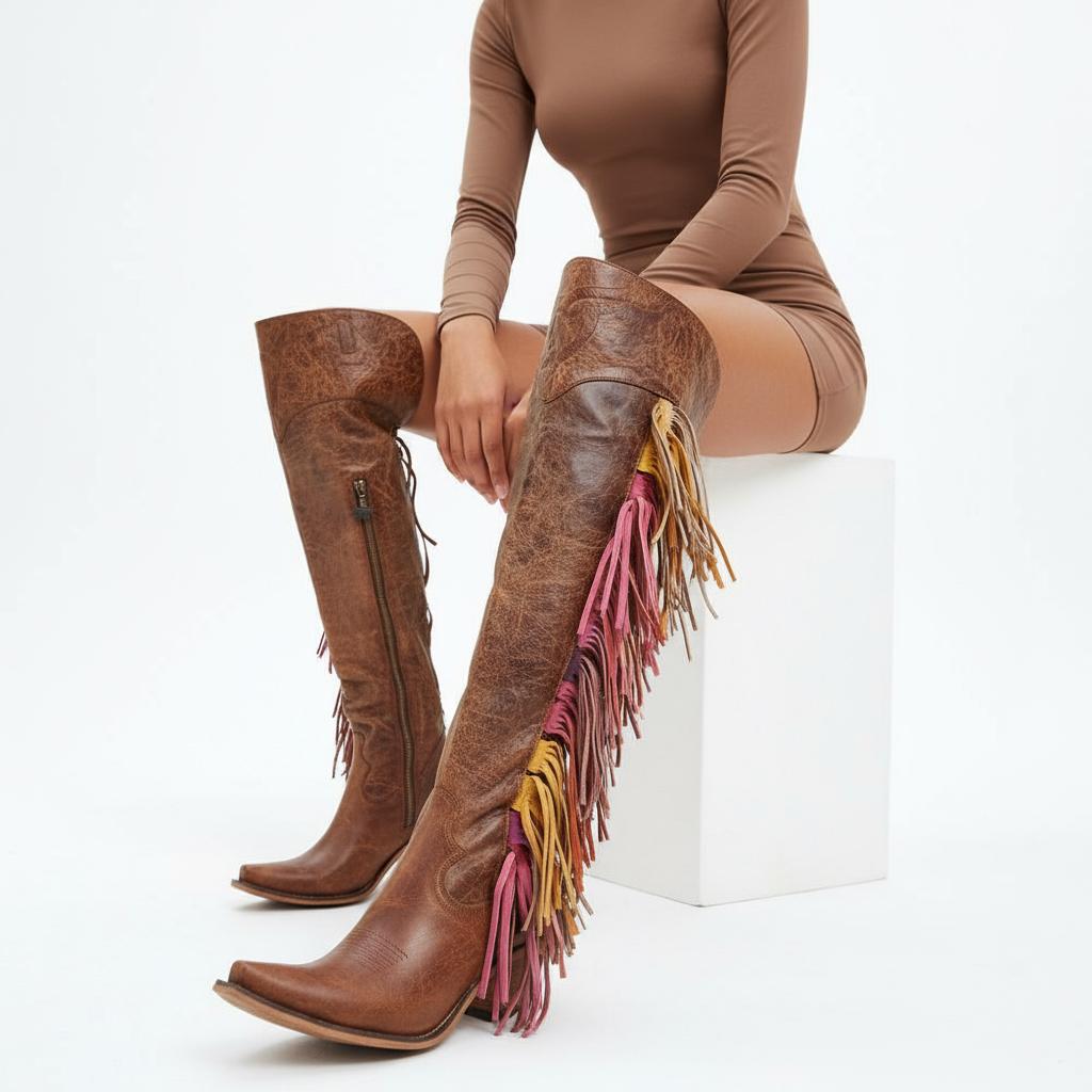 Embrace your bold style with our Western Over Knee Boots, crafted from luxurious faux suede. Each boot features an exquisite fringe and heart pattern, showcasing unique craftsmanship that captures attention and admiration. Designed with precision and care, these boots are perfect for the fashionable boho lifestyle.