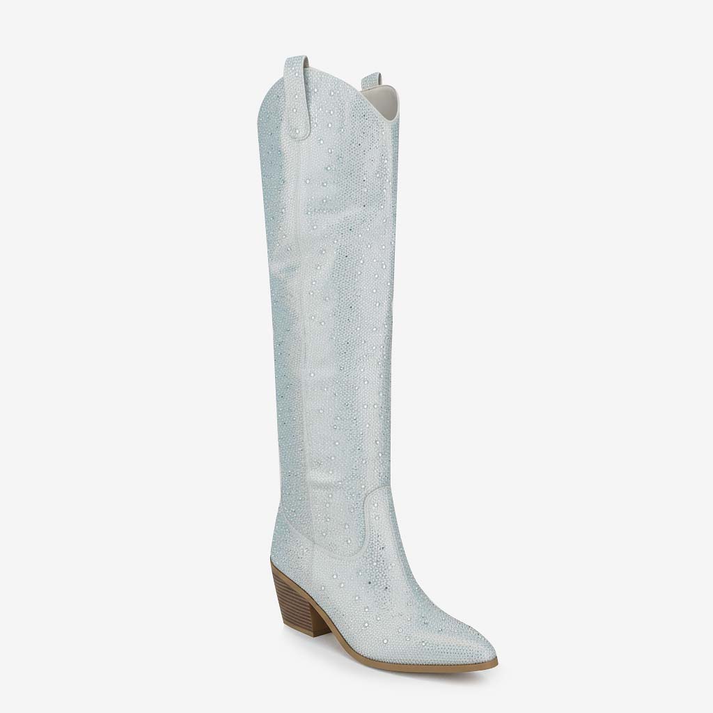 Introducing our Silver Sparkly Rhinestone Round Toe Zipper Slanted Heel Western Over-Knee Tall Boots, meticulously crafted from high-quality PU leather and lined with vegan leather. This unique blend ensures durability while highlighting an exquisite rhinestone-studded design that makes these boots a standout choice for any occasion.