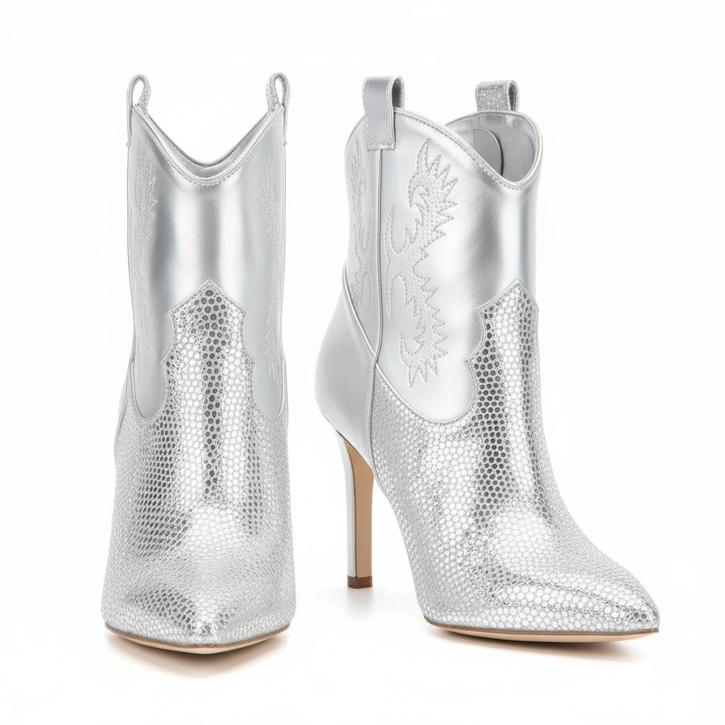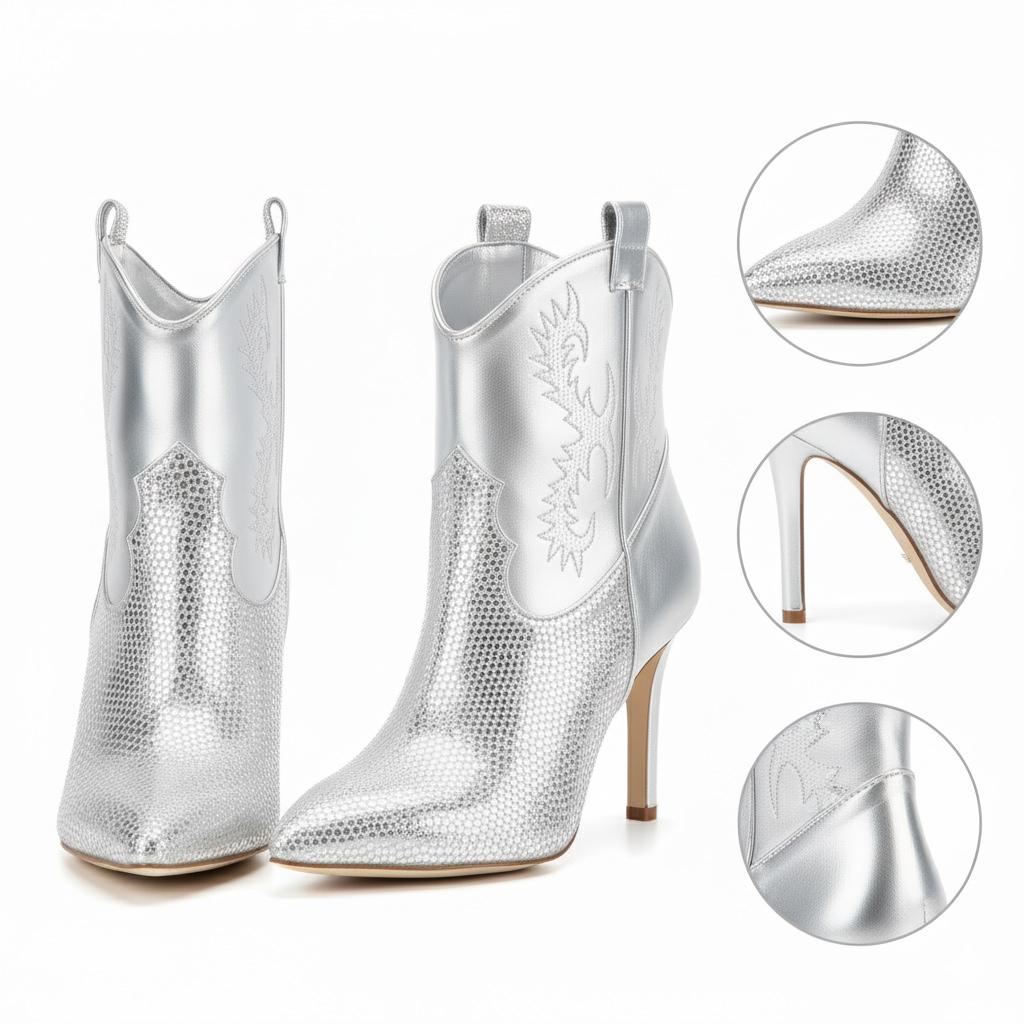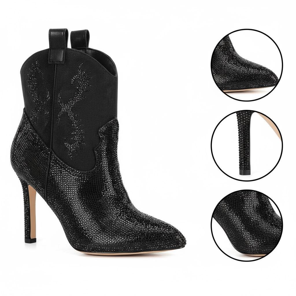 Elevate your style with our Western Rhinestone Stiletto Ankle Boots. Crafted from luxurious full-grain leather, these boots feature stunning rhinestone embellishments that add a touch of elegance to any outfit. The unique design combines both sophistication and comfort, making them perfect for various occasions from casual outings to glamorous parties.