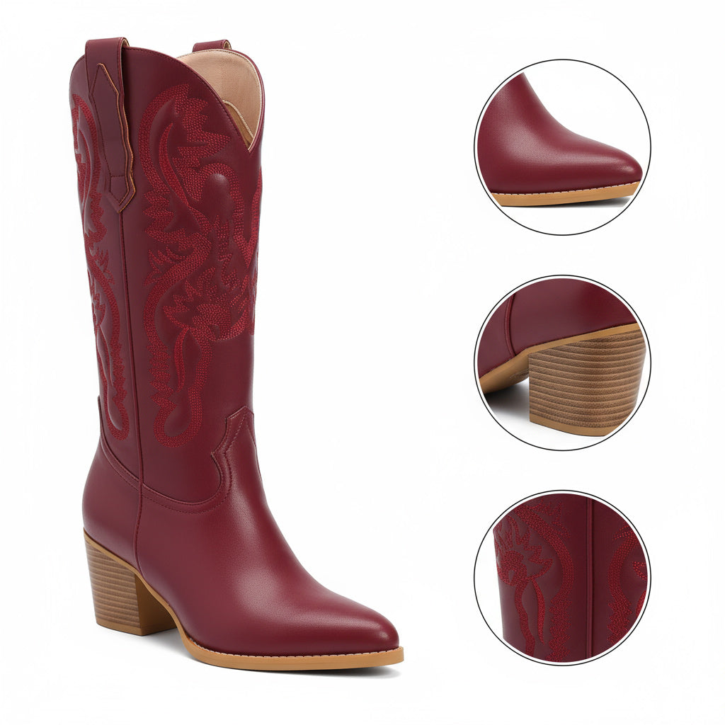 Crafted from premium PU vegan leather, these mid-calf boots combine elegance with ethical fashion. The unique floral embroidery adds a touch of sophistication, while the pointed toe design enhances your silhouette. Perfect for the modern fashionista, these boots are not just footwear; they are a statement.