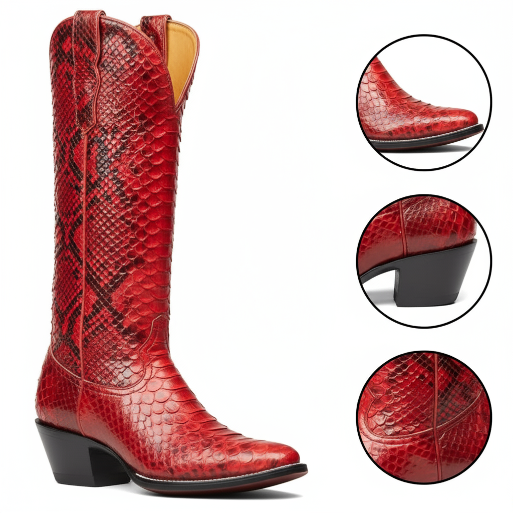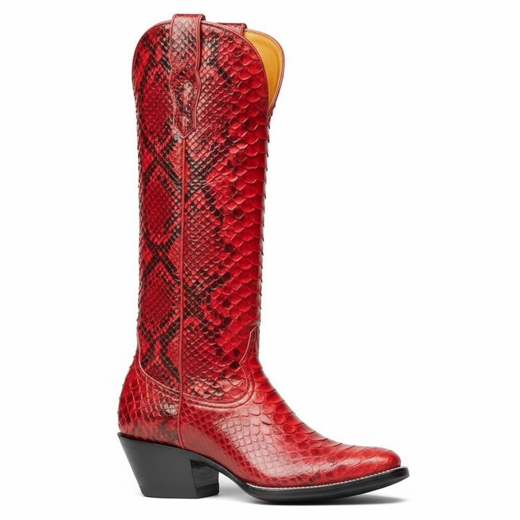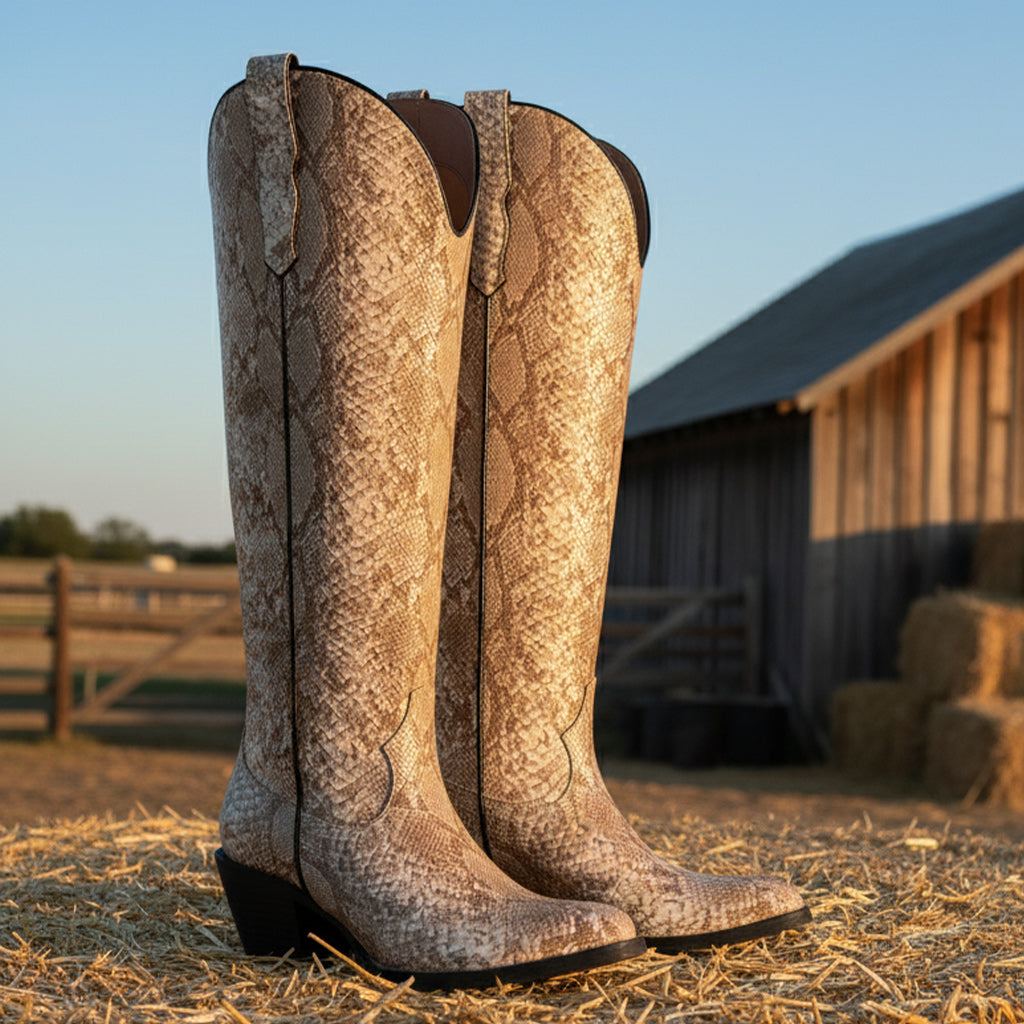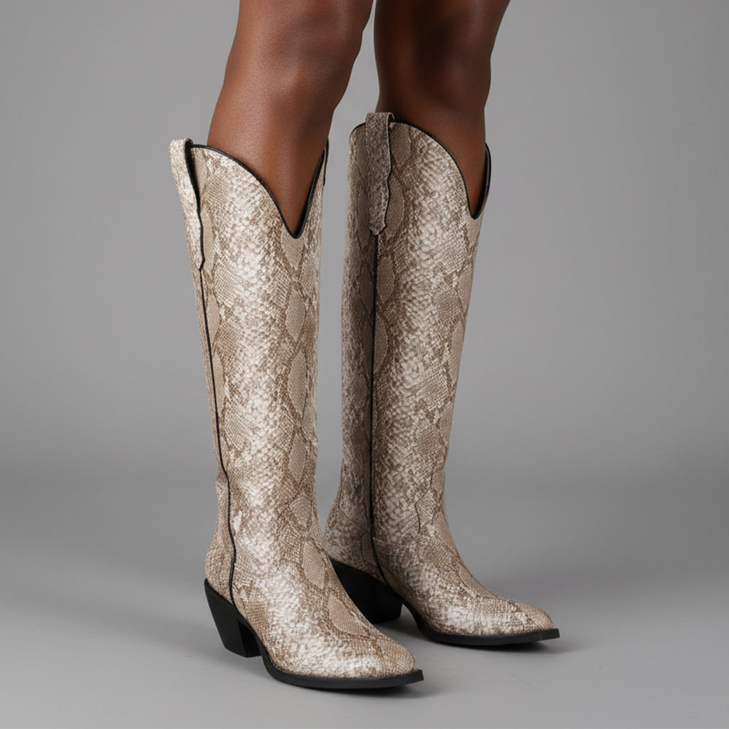 Discover the perfect blend of style and comfort with our Western Style Knee-High Boots for Women. Meticulously crafted from premium full-grain vegan leather, these boots showcase a unique animal print design that adds a touch of elegance to any outfit. The distinct handcrafted precision ensures a high-quality finish that stands out.