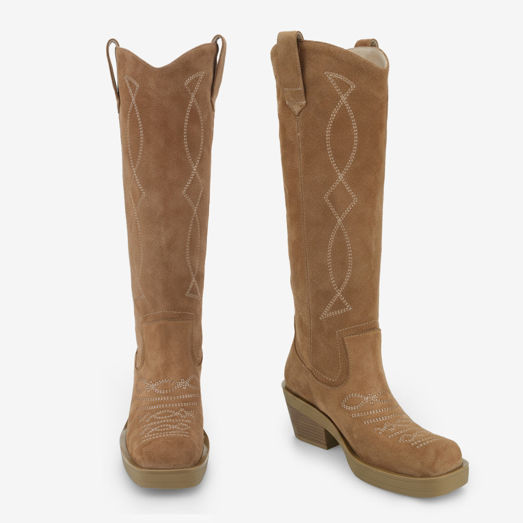 Elevate your style with our exquisite knee-high boots crafted from luxurious faux suede. The soft texture and intricate embroidery details add a touch of uniqueness that sets you apart. Designed with a square toe and chunky heel, these boots blend classic western aesthetics with modern comfort.