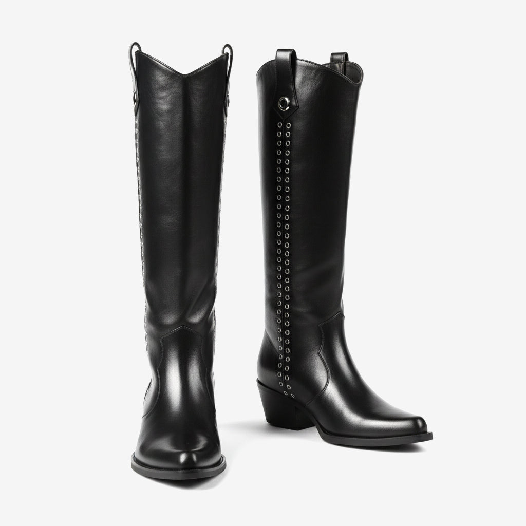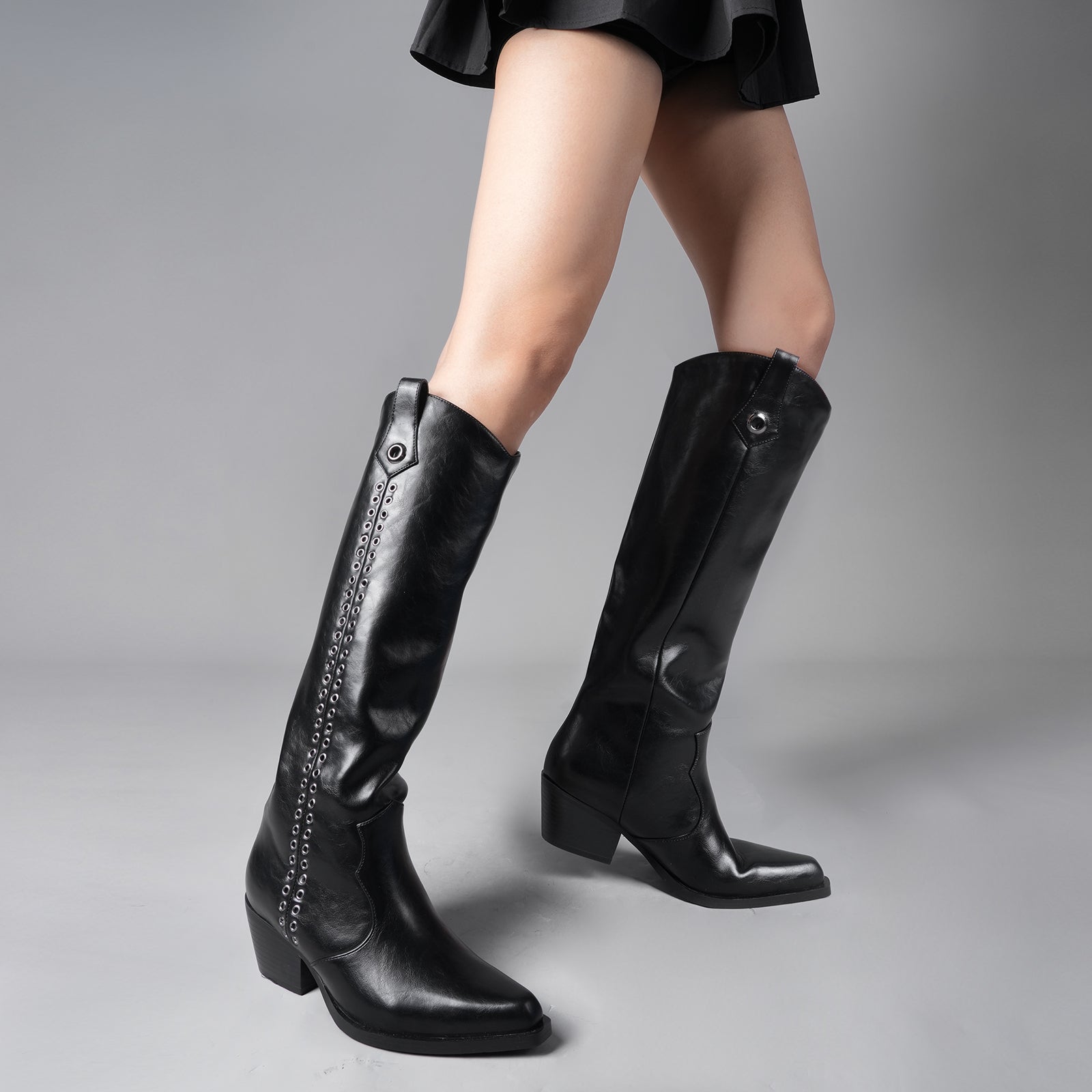 Elevate your style with our stunning Knee-High Western Cowboy Boots designed exclusively for women. Crafted from premium PU leather, these boots offer a luxurious feel while ensuring durability. The unique design features intricate studded accents and a sleek, minimalist look that sets you apart. Embrace every occasion with these fashionable boots that blend style and substance effortlessly.