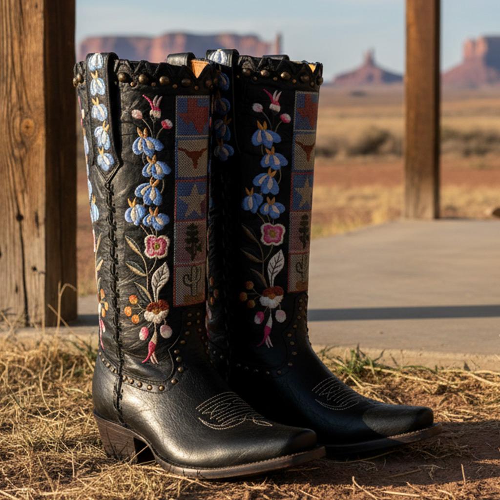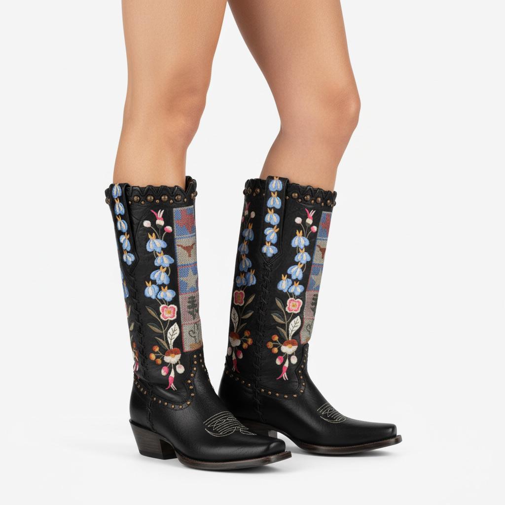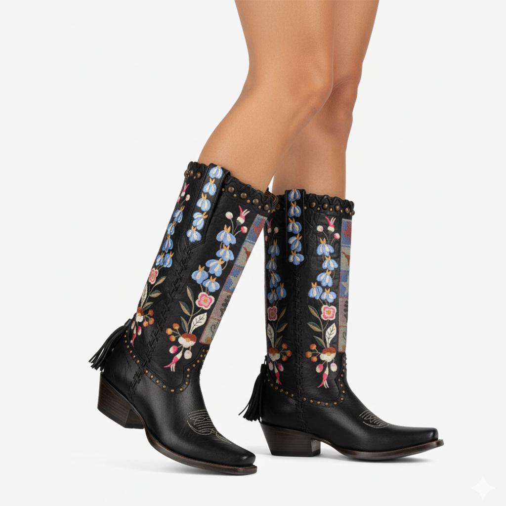 Elevate Your Style with our Western Style Mid-Calf Boots, featuring a stunning floral design combined with eye-catching stud details. Handcrafted with premium full-grain leather, these boots are not just shoes but a unique fashion statement, crafted with meticulous attention to detail for the modern woman who values both style and quality.