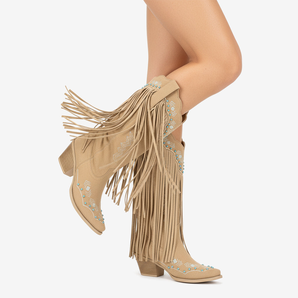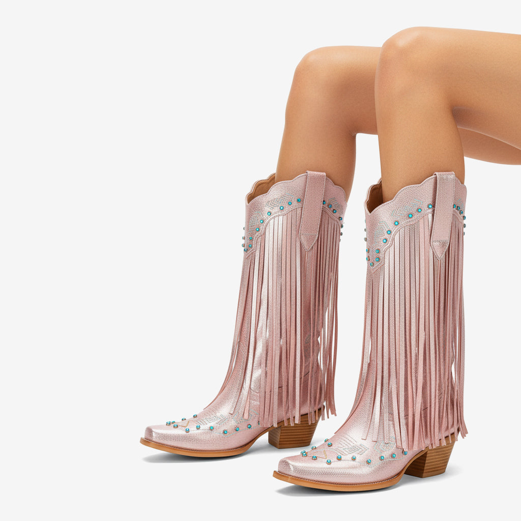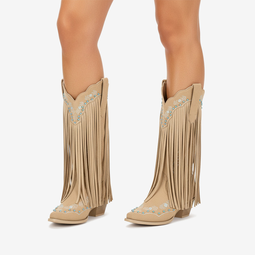 Introducing our Western Style Mid-Calf Boots, an exquisite blend of premium full-grain leather and handcrafted details. Each pair is thoughtfully designed with trendy fringe and stone embellishments, showcasing a unique craftsmanship that captures attention while exuding sophistication.