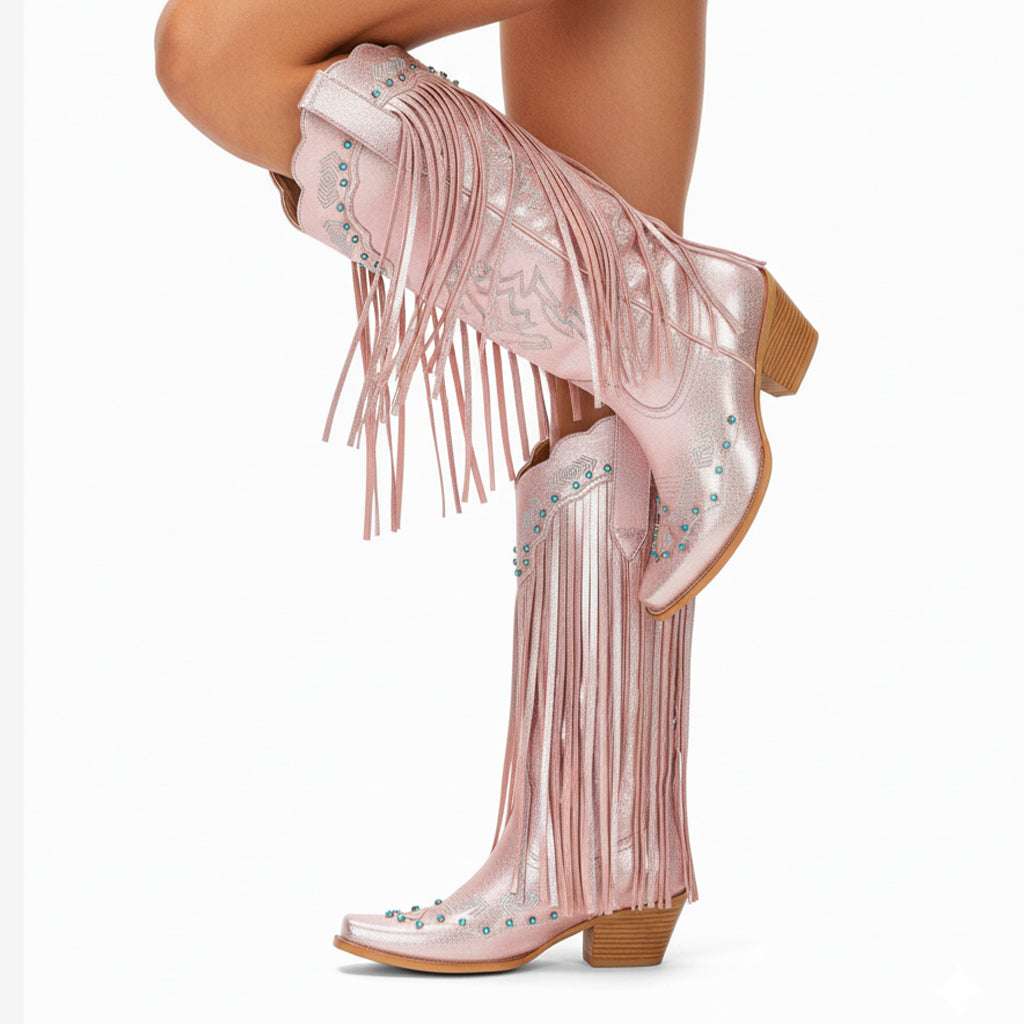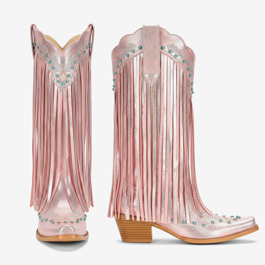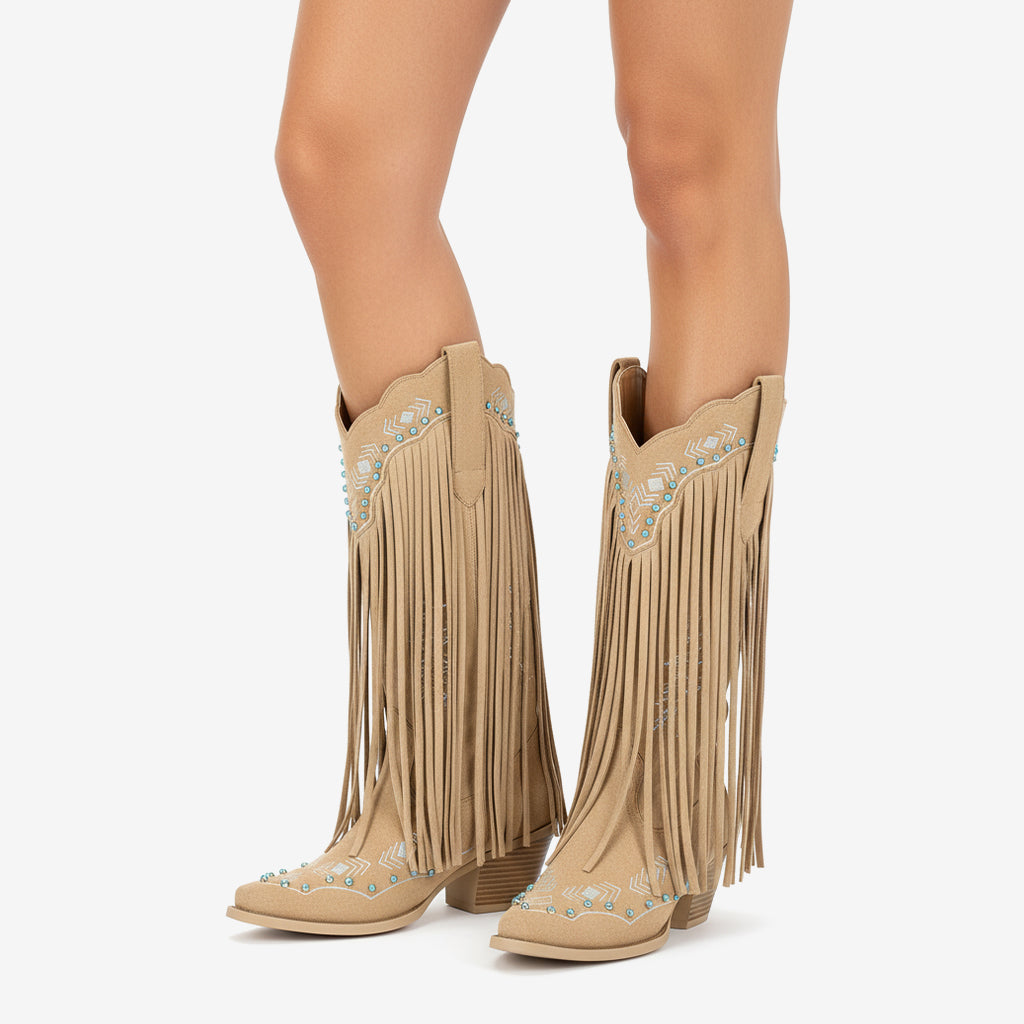 Introducing our Western Style Mid-Calf Boots, an exquisite blend of premium full-grain leather and handcrafted details. Each pair is thoughtfully designed with trendy fringe and stone embellishments, showcasing a unique craftsmanship that captures attention while exuding sophistication.