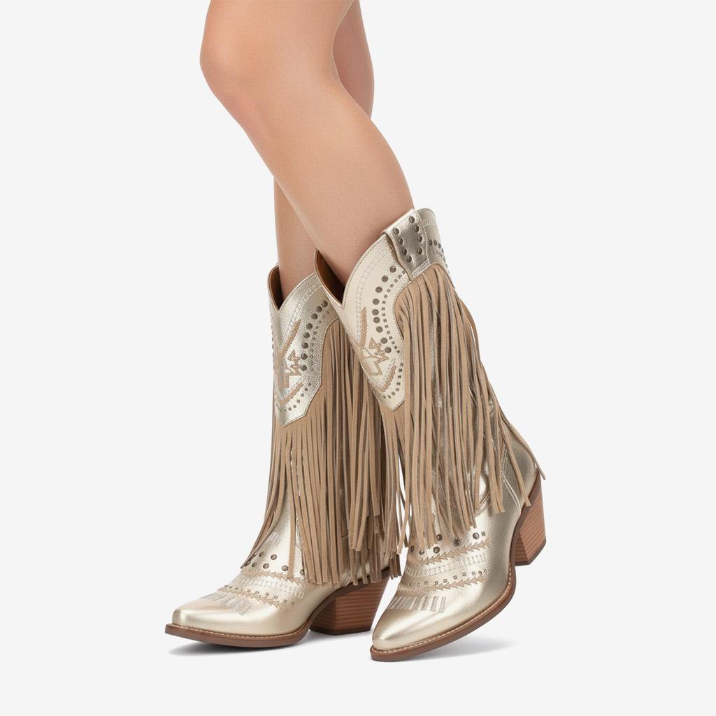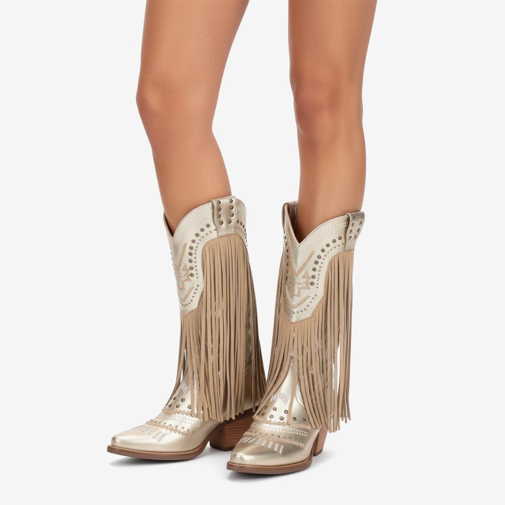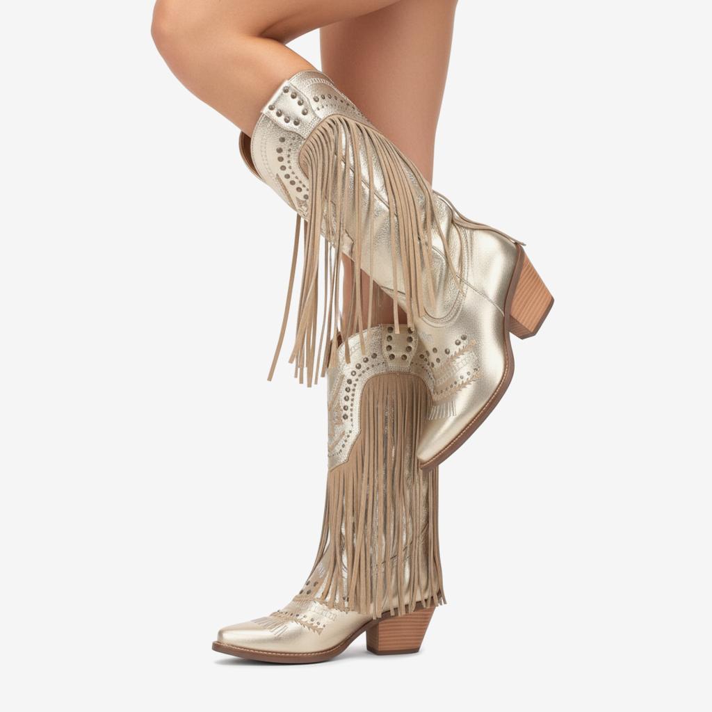 Step into effortless elegance with our handcrafted Western boots. Designed for the modern woman, these boots combine unique craftsmanship with trending style elements, ensuring you stand out at any occasion. The rich full-grain leather and intricate embroidery, alongside statement-making fringe and studs, showcase an artistry that is both timeless and chic.